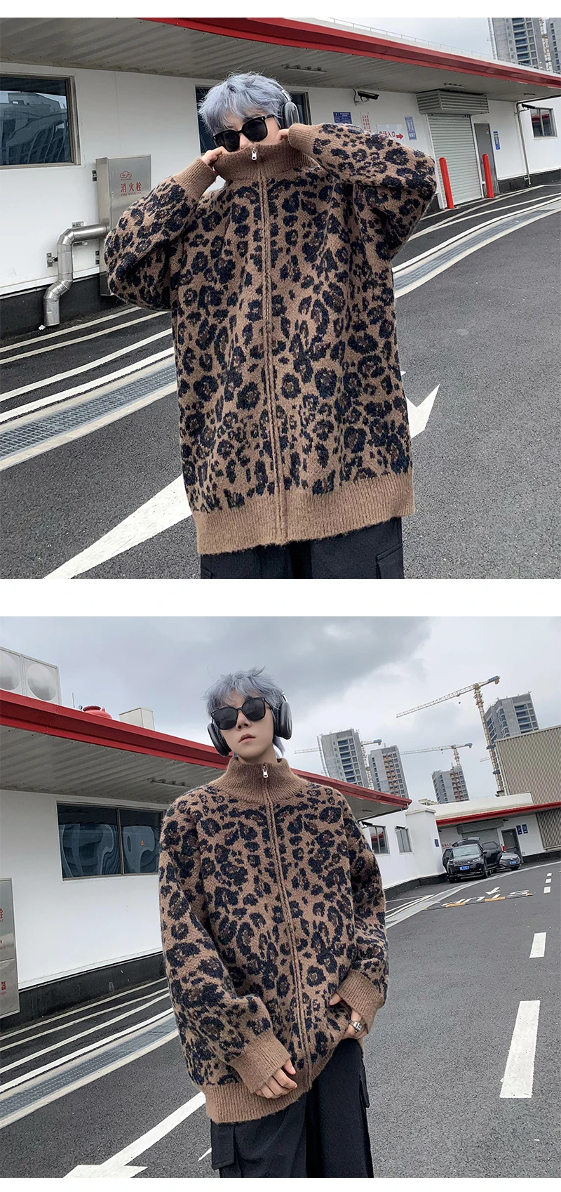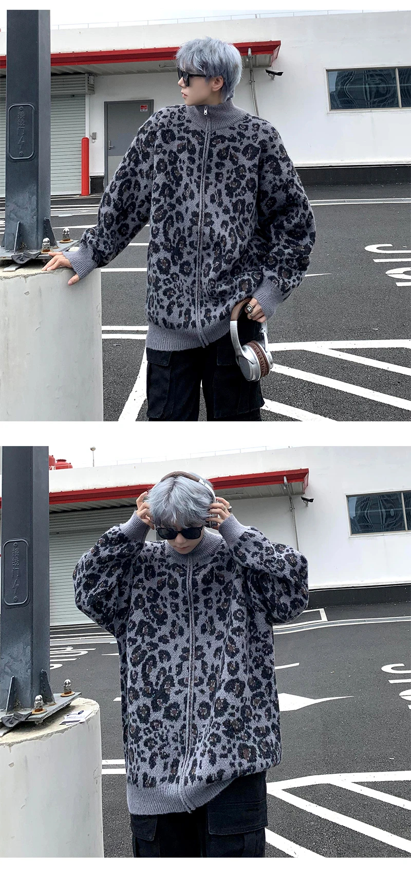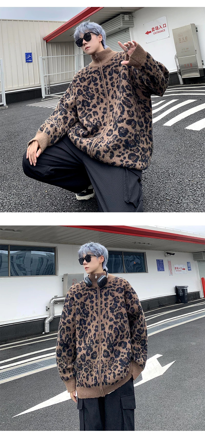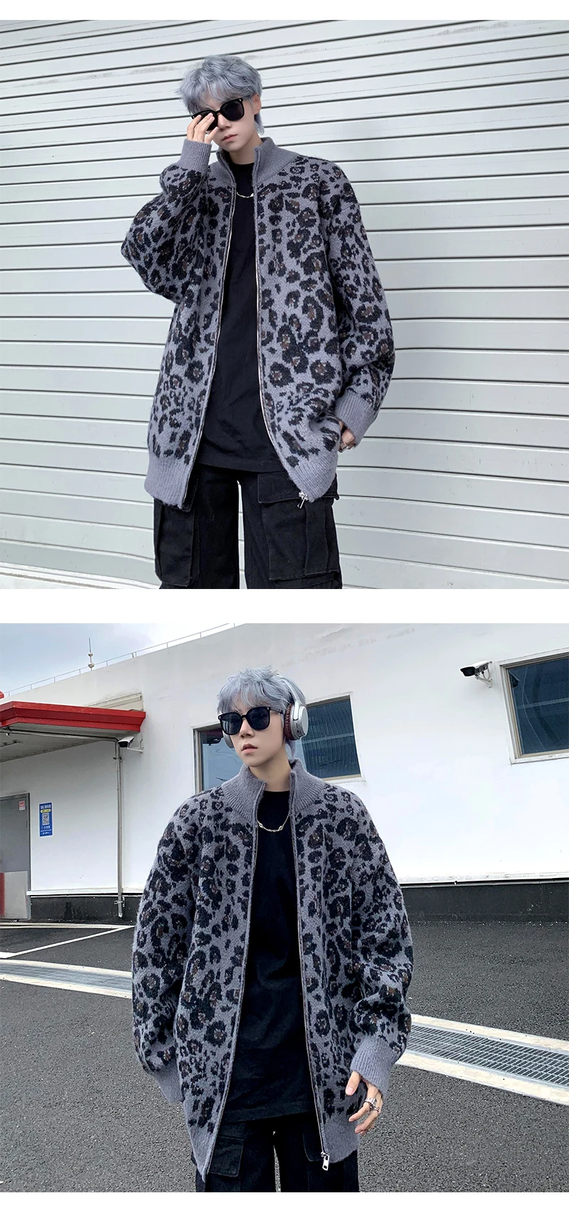 Retro Leopard Knit Cardigan Sweater Men's Jacket Korean Streetwear Popular Zipper Long Sleeve Knitwear Unisex Outwear – GURUNVANIS